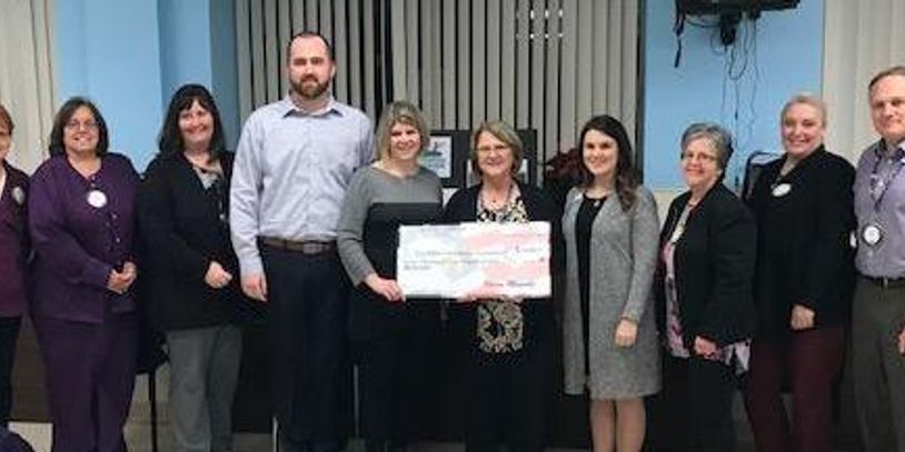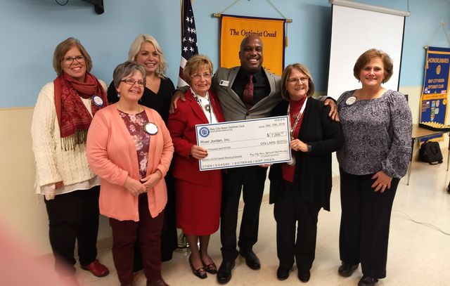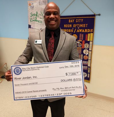 Aland Stamps, CEO River Jordan accepting a check for $7, 000 from the Bay City Noon Optimist Club Camel Race Committee.